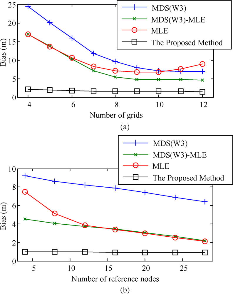 Bias performance of the proposed algorithm and previously proposed methods (a) versus the number of grids and (b) versus the number of reference nodes.