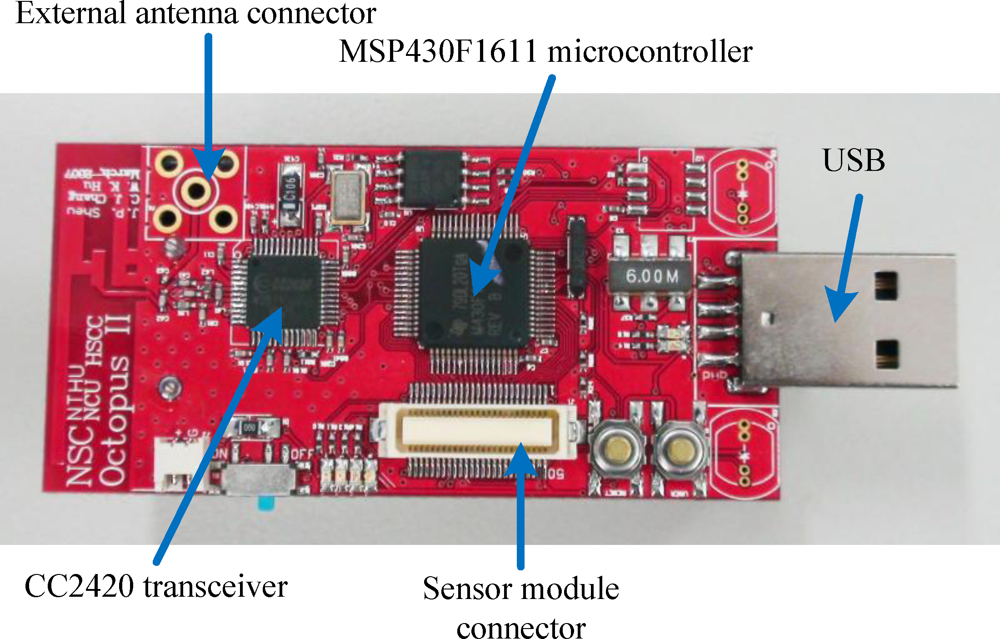 In this subsection, we apply the proposed algorithm to real-world scenarios using a WSN platform. The sensor nodes used in this study are Octopus II-A [43], as shown in Figure 9. Octopus is an open-source visualization and control tool for sensor networks developed in the TinyOS 1.x environment [44]. It consists of a MSP430F1611 microcontroller, a USB interface, and an onboard inverted F and SMA type antenna. Its specification is very similar to the Tmote-Sky sensor node [45]. CC2420 is an RF transceiver responsible for measurements of the RSSI patterns.