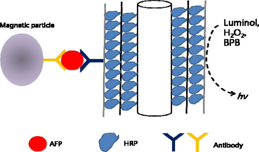 A multilayered enzyme-coated carbon nanotube design has been studied as an ultrasensitive chemiluminescence immunoassay (CLIA) for detecting AFP in human serum samples. Horse radish peroxide (HRP) was absorbed into MWNTs, allowing maximized ratio of HRP/antibodies for sensitivity enhancement. After separating the MWNT-AFP by applying magnetic beads with antibodies, bromophenol blue (BPB) and H2O2 was added to the separated solution. The chemiluminescence reaction was triggered by injecting luminol into the solution (Figure 10). This system proved to have a detection limit that was two orders of magnitude lower than standard ELISA method [].