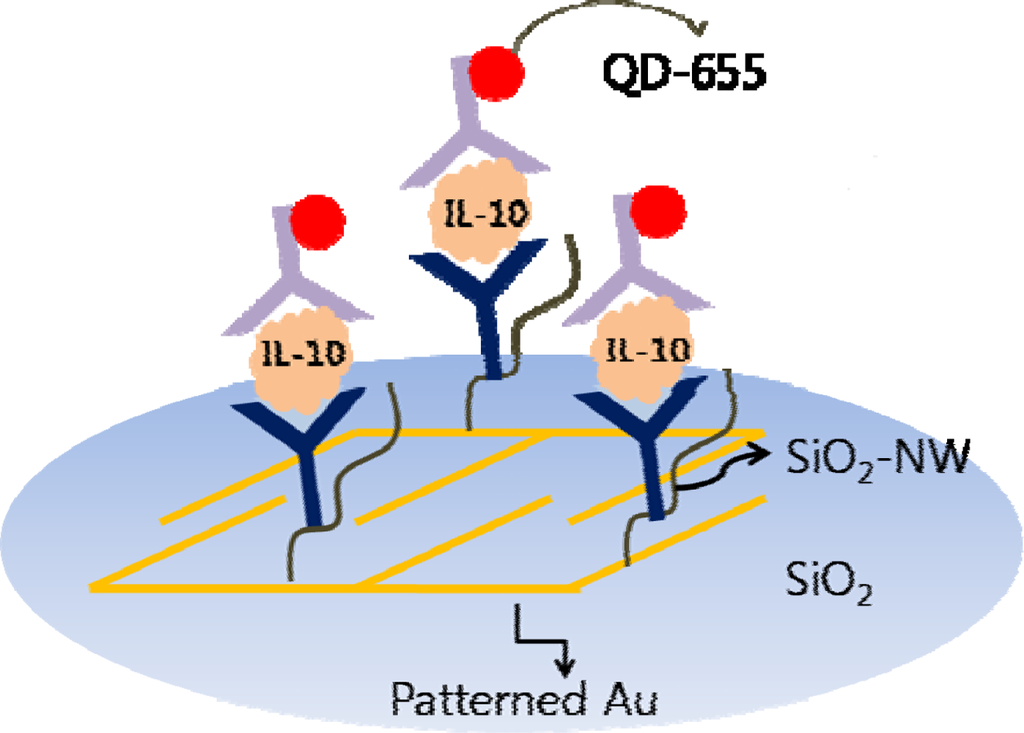 Optical sensing of IL-10 using functionalized SiO2-NW and QD labels on a patterned Au substrate.