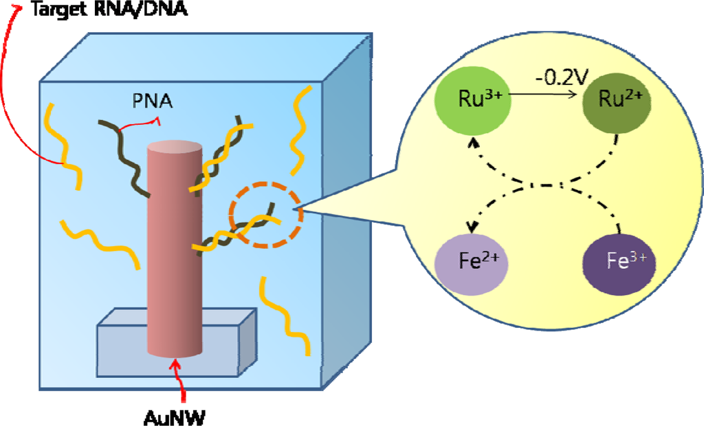 RNA detection via PNA functionalized gold nanowire (AuNW). Solution contains two redox reporter groups; Ru(NH3)63+ and Fe(CN)63–. Ru(NH3)63+ is attracted by DNA at electrode surface and through negative potential sweep, Ru(III) is reduced and regenerated by Fe(III) oxidant for multiple turnovers.