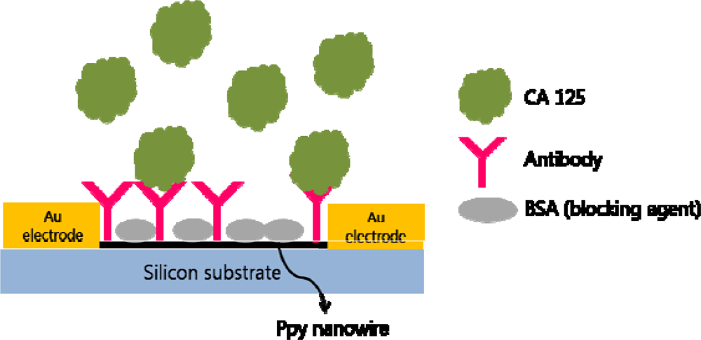 Conducting polymer nanowires were synthesized for chemoresistive sensor device. Polypyrrole (Ppy) nanowires were used in this study and the surface was functionalized with cancer antigen CA 125 antibody (Figure 16). A single Ppy nanowire was integrated into a FET system, just like carbon nanotubes, and the measurements of changes in conductivity due to biomolecule recognition events were measured [].