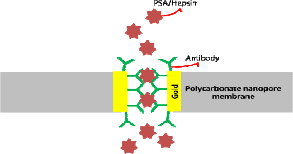 Nanopores, including synthetic, artificial, and protein-based, have been of great interest to many researchers for detecting biomolecules. Various studies have been conducted on nanopores for sensing biomolecules including DNA [–], proteins [,], ions [,], and drug molecules []. Nanopore membranes functionalized with antibodies was used to detect hepsin and PSA (Figure 19). Electrochemical impedance spectroscopy was used to monitor changes in ionic conductance before and after the antigen-antibody interaction. Results showed increased impedance after the specific interaction, and a linear relationship of change in impedance versus antigen concentration was recorded [].