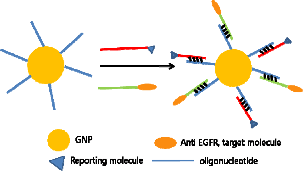 For GNPs as stable and versatile molecular imaging agents, a complementary oligonucleotide-based approach has been proposed. A 5′-thiol-modified and 3′-NH2-modified oligonucleotide was coated onto the nanoparticles and subsequently conjugated with anti-EGFR proteins through DNA-DNA hybridization. Through this study, gold nanoparticles have proven to be effective reflectance contrast agents for molecular imaging. As well, by hybridizing oligonucleotides with reporting molecule, the modified GNPs could also be used as a multifunctional contrast agent and be imaged with fluorescent confocal microscopy in parallel (Figure 2). These modified GNPs have been proven to be superior to contrast agents where the protein was adsorbed directly, in terms of size and stability [].