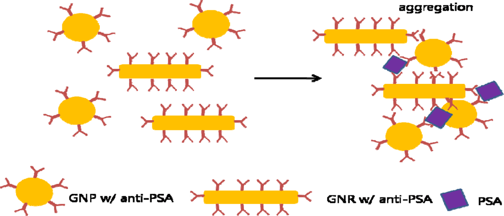 Aggregation of GNPs and gold nanorods in the presence of PSA, leading to DLS analysis for the immunoassay.