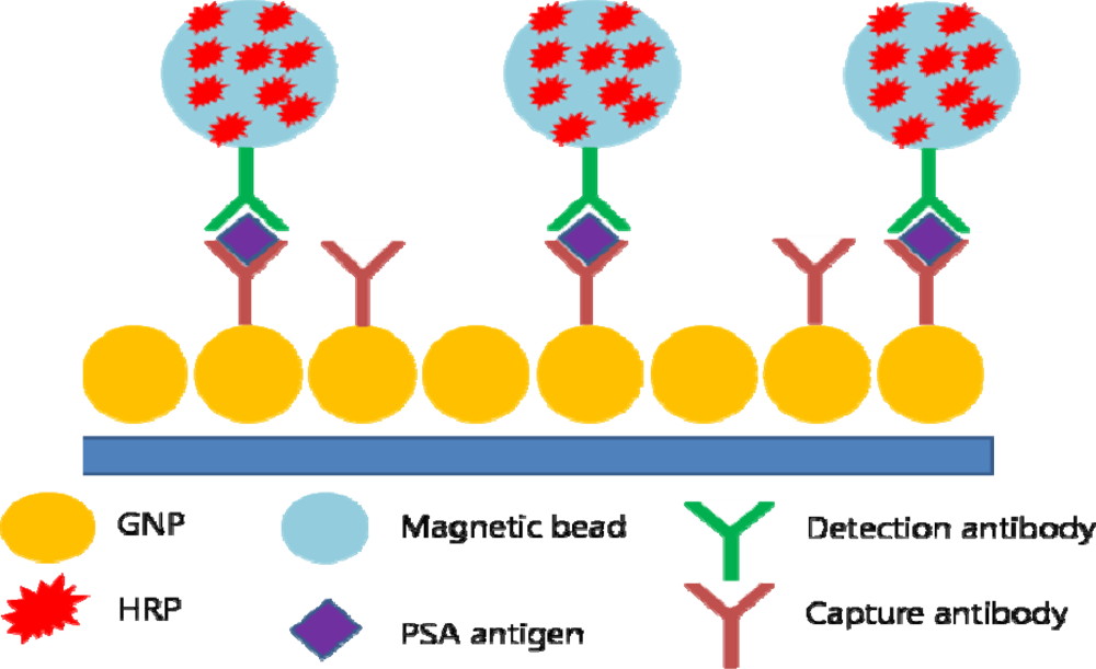 Gold nanoparticles are used as molecular imaging agents, but GNP film electrodes have also been proven to be useful in detecting cancer biomarker proteins. By applying multilabeled detection antibody-magnetic bead bioconjugates, an ultrasensitive electrochemical immunosensor for cancer biomarker proteins has been designed. Magnetic beads have been conjugated with horse radish peroxide (HRP) and a secondary antibody, providing multiple enzyme labels for each PSA to be detected. On the surface of the GNP electrode, capture antibodies have been attached for PSA antigen binding. By applying voltage and H2O2, a sensitive immunosensor was realized (Figure 4). The authors claimed the immunosensor was better than a previously reported carbon nanotube (CNT) forest immunosensor with multiple labels on the CNTs [].