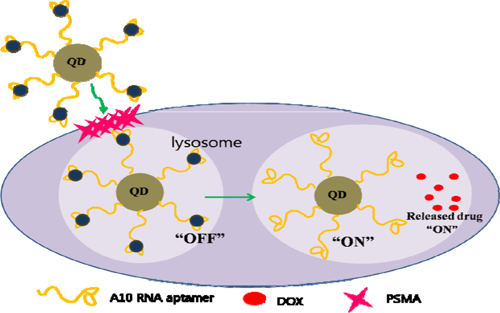 A multifunctional nanoparticle with biomolecules conjugated to QDs has been used in cancer targeting and drug delivery []. A10 RNA, aptamer that recognizes prostate specific membrane antigen (PSMA), was conjugated to the QD to target cancer cells []. Doxorubicin (DOX), a well known anthracycline drug with fluorescent properties, was intercalated in the conjugate. This conjugate offers an exciting method of imaging cancer cells. The intercalated DOX within A10 RNA conjugated to the QD quenches the fluorescence of both DOX and QD. When the QD-aptamer (DOX) conjugate finds the target cancer biomarker, it is taken into the cancerous cell through endocytosis. When DOX is released from the conjugate, both of them recover their fluorescent properties and thus can be imaged. With this design, the multifunctional nanoparticle can be fabricated so that cancer biomarkers can be detected precisely and the drug is delivered within the cancer cell, giving high specificity (Figure 5).