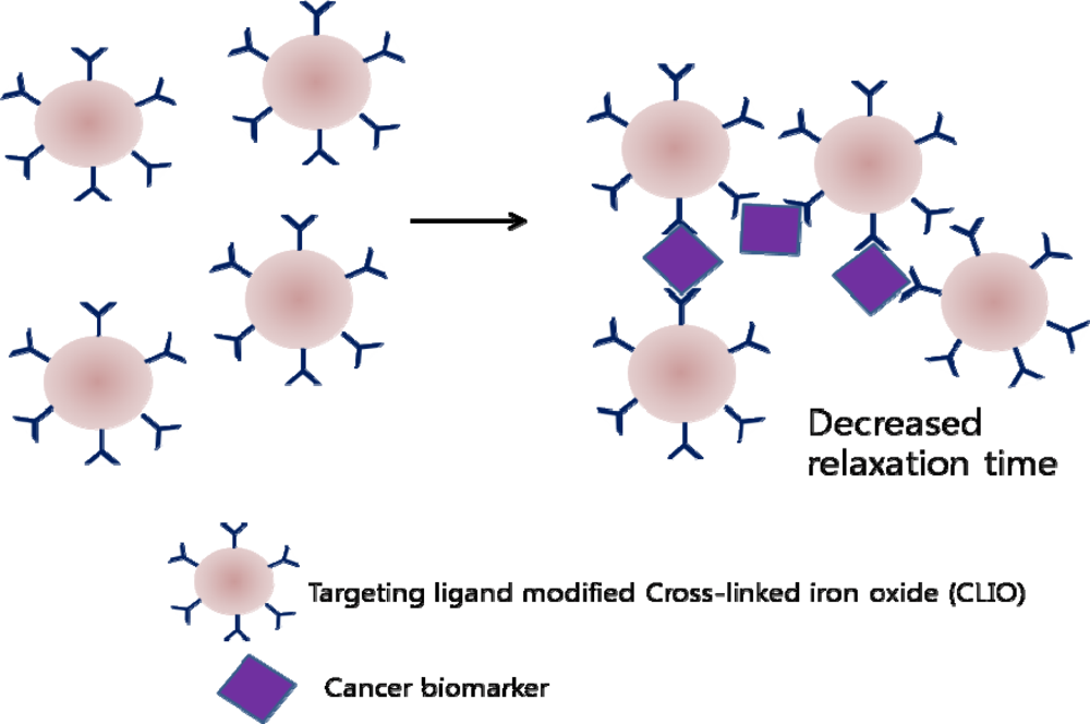 Magnetic nanoparticles have been widely used in cancer cell imaging. By using the principle of decrease in transverse relaxation time due to aggregation of magnetic nanoparticles in presence of target molecules, concentration of cancer biomarkers could be measured []. This device allowed in vivo, local environment monitoring for cancer biomarkers and could be left implanted after tumor surgery. This exciting new method is expected to be a convenient method for continuous monitoring since biopsies do not have to be performed for each screening. A similar approached has also been used in the past to develop a biosensor to detect cancer biomarkers in turbid samples (blood, urine, and sputum) []. When magnetic particles aggregate through affinity ligands to the molecular target, a decrease in the bulk spin-spin relaxation time of surrounding water molecules occurs. This could be used as a chip-based nuclear magnetic resonance (NMR) system, and with miniaturization and multiplexing, detection of various biomarkers within a small sample volume could be achieved (Figure 7).
