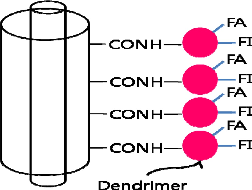MWNT functionalized with fluorescein isothiocyanate (FI) and folic acid (FA) modified amine-terminated dendrimers. FA is for targeting cancer cells that over-expresses FA receptors and FI dye for imaging.