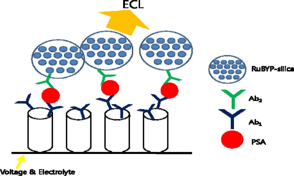 Single-wall carbon nanotubes (SWNT) with [Ru-(bpy)3]2+-doped silica nanoparticles have been studied as an electrochemiluminescent immunosensor for PSA detection (Figure 9). The doped silica nanoparticle provides significant electrochemiluminescent signal amplification by trapping thousands of [Ru-(bpy)3]2+ (RuBPY) and can be detected with a much simpler measurement systems than the commercial bead-based electrochemiluminescence (ECL) assays. Thus, an ultrasensitive amperometric immunosensor for PSA detection has been designed based on CNTs [].