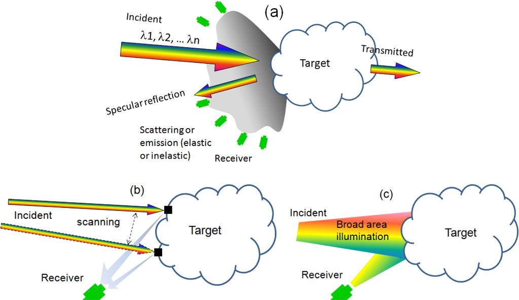 The generic concept of laser multi-spectral imaging is quite simple and is illustrated in Figure 1(a). A multi-spectral laser source excites the target, which can be a gas or condensed matter. The receivers, which can be single-element detectors, arrays, or focal plane arrays, measure the target responses. Being both imaging and spectroscopy, the technique can employ any combination of approaches from either field. Imaging can be achieved by scanning as illustrated in Figure 1(b), where the directionality of the laser beam is used to map point by point, or by staring as illustrated in Figure 1(c), in which the entire illuminated area is mapped. A hybrid approach can be achieved by applying the staring mode over a small illuminated area, and the scanning mode over a large area. All imaging techniques are well established, employed from short-range laser scanners to longer range 3D LIDAR. In addition, other hybrid approaches including spatial encoding or multiplexing techniques, similarly to structured light can also be applied. Which approach to use depends on applications; however, as discussed in Section 3, it is important to consider the system optimization issue for low-power semiconductor lasers, which is more complex than just basic simple noise considerations.