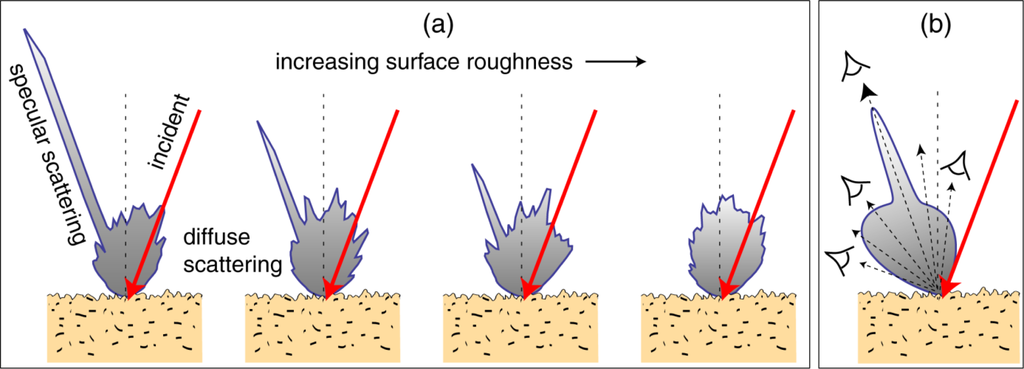 It should be noted that Equation (A.24) has general validity for diffuse scattering and is not limited to that of Figure (A.1); and it was used for the FDTD computer simulation of scattering from a rough surface as illustrated in Figure 10, except that coefficient r(λ;k) is not that of Equations (A.18.a) or (A.20.a) but represents the backscattering amplitude.