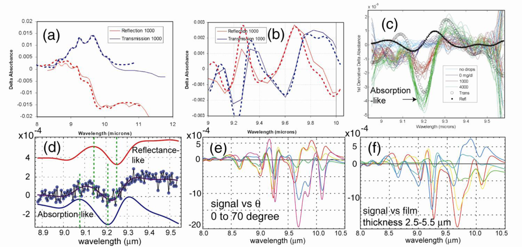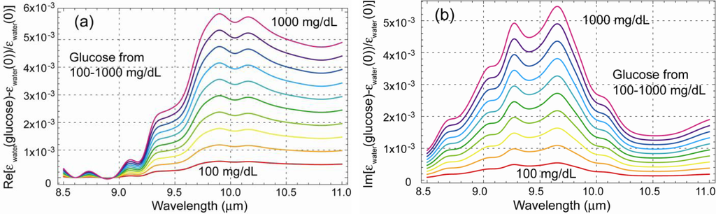 - It is desirable that the term dS0/dλ of Equation (A.28.c) does not have spectral features that mask those of Reε̃X(λ), Imε̃X(λ), d Re ε̃X/dλ, and d Im ε̃X/dλ of Equation (A.28.a). For the glucose experiments in Section 6.2, neither water nor the substrate has sharp features in the 9–10 μm range. dεs/dλ and dεf/dλ contribute at most a gradual linear baseline, which does not overwhelm d Reε̃X/dλ and d Im ε̃X/dλ. It is obviously futile to detect the signature of contaminant X over a spectral range in which the solvent and/or a substrate have the same or similar spectral signature.