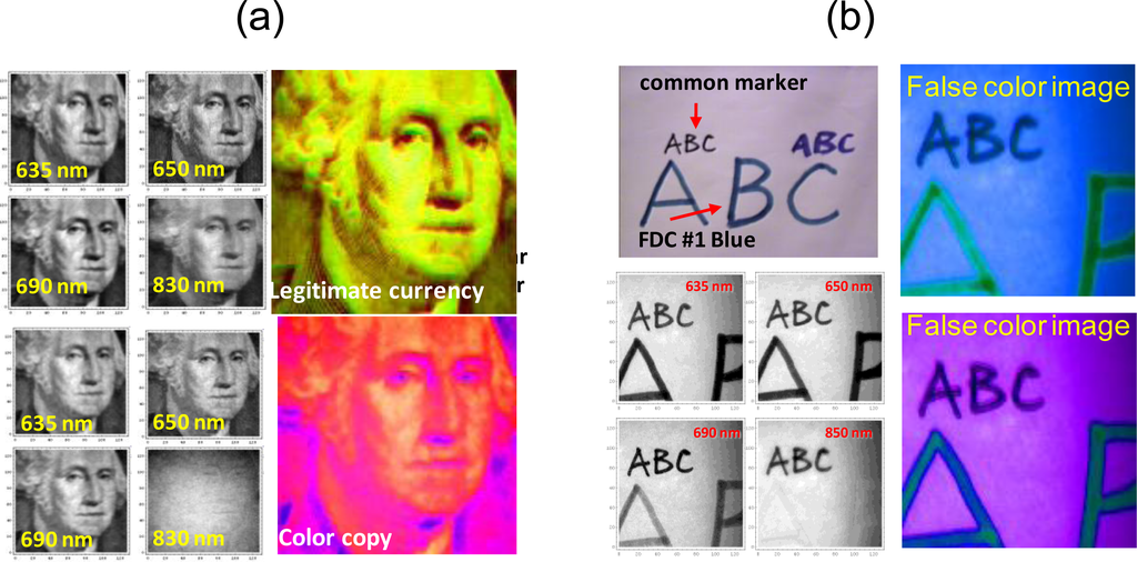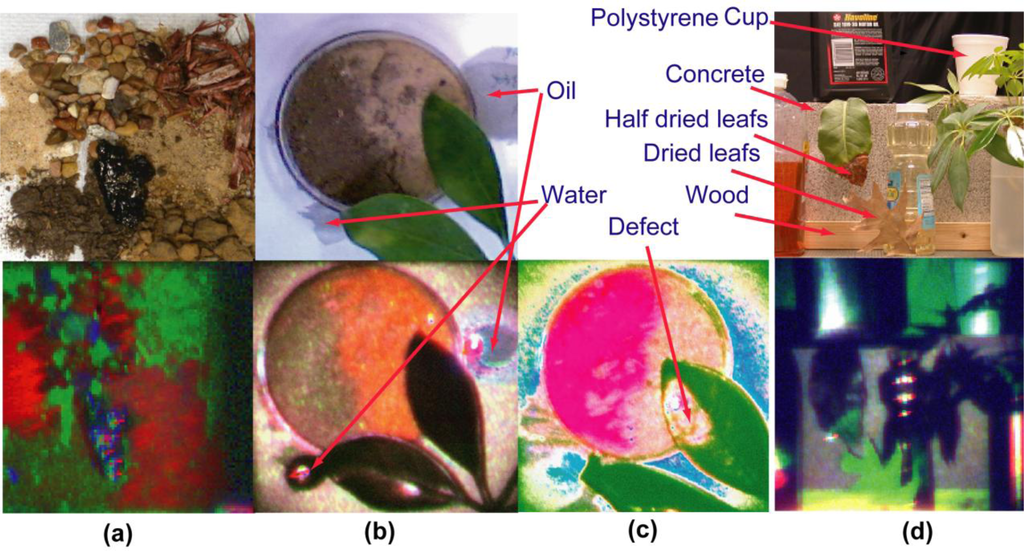 Figure 8(a) shows the visible image of an aluminum plate contaminated with four different oils, two are bio-organic and two are petroleum hydrocarbons. The oil films were estimated to be <100 μm thick. In the IR multi-spectral FCI of Figure 8(b), the oil patches appear as green/blue, and the metal appears red/yellow. The Al plate had strong specular and speckles components, overwhelming the receiver dynamic range. Attenuating the optical signal to avoid saturation by the Al signals rendered all other features noisy. This is the problem of limited dynamic range as discussed in Section 3. Nevertheless, this case is also an example of the discussion in Section 2.1 about discrimination without spectroscopic identification.
