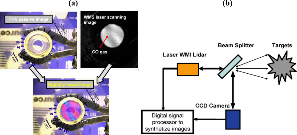 (a) Top left: a CCD visible image of the CO gas tube. Top right: the 2nd order wavelength modulation spectroscopy (WMS) image of the entire scene, measured at the 4.88693 μm, showing only the signature of CO absorption, since all other objects have negligible 2nd order WMS signals. Bottom: a synthetic image, obtained by digital combination of the CCD visible image in top left with the 2nd order WMS image in top right. (b) Concept diagram of a combined passive and active imaging system that would allow synthetic images such as the bottom of (a) [22].