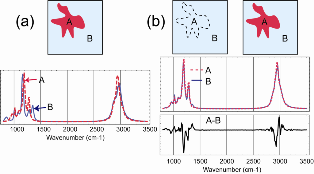 A conceptual comparison of these two approaches is illustrated in Figure 2. Suppose the target is a surface contaminated with some chemical agent. In Figure 2(a), area A and B have spectra as shown. The phenomenological approach can distinguish them based on their difference, and mark them with different colors in a false color image (FCI), even as the approach does not recognize either spectrum. The prior-knowledge approach does not care about their difference (A–B), but tries to match A and B to a library of known spectra. If the matching is successful for both A and B, then this approach is more informative than the phenomenological approach.