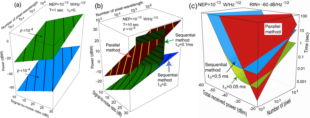 A calculation based on a more realistic noise model is shown in Figure 3(c), which addresses the reverse question of Figure 3(b): given a power P, what is the time it takes to obtain an entire image? Figure 3(c) shows the net time T as a function of received power ρP and the number of spatial pixels Q. Here, the calculation assumes that all L = 25 wavelengths are measured in parallel, and the spatial pixels are measured sequentially. It employs the hybrid model of Equation (A.8) in the Appendix Section A. As labeled, the top plane corresponds to Tparal. The other two surfaces represent Tsequent with two different dead times t0 = 0.05 ms and 0.5 ms. The results show the obvious rule that for both methods, the higher the received power is, the faster the measurement will be. When the return power is scarce, the sequential method is better. But when signal power is ample, the parallel approach is faster as expected, as the sequential method is limited by the dead time, unless at large Q as shown in Equation (3.a).