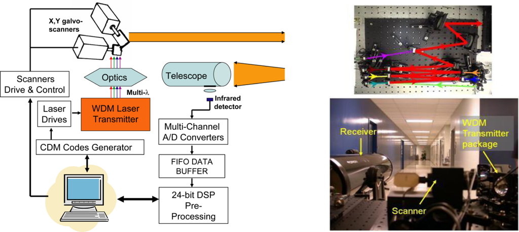 Left: block diagram of the multi-spectral laser imaging system. Right-top: wavelength-division multiplexed transmitter for vis-near-IR diode lasers. Right-bottom: mid-IR system.