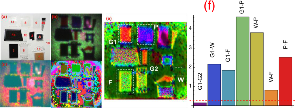 (a) A visible image of the target. (b,c,d) False color images (FCI) from the same IR spectral images with different phenomenological approaches. The algorithms for (b) and (c) do not remove the contrast between the background and the objects, showing that most were highly absorptive (dark appearance) and resulting in under-classification of the objects. The algorithm for (d) over-classifies them and makes more color distinction than physically meaningful. The algorithm for (e) preserves the laser spectral data in lieu of intensity, resulting in physically relevant classifications. Notice that colorless materials (black or transparent) in (a) have “colorful” mid-IR signatures in (e). (f) Bhattacharyya distances between various objects labeled in (e). The red dashed line marks the threshold value for two colors to be considered statistically different. As shown, various objects are spectrally more distinguishable than the FCI in (e) can represent [24].