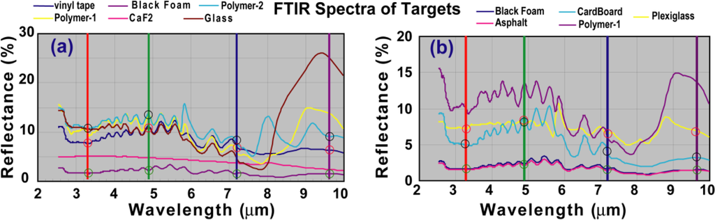 For this test, FTIR reflectance spectra of various objects were obtained and shown in Figure 6. They were calibrated against a gold mirror which served as a reference. Most materials were strongly absorptive and their spectra were dominated by systemic background artifacts in the 3–8 μm region, and have some characteristic signatures in the 8–10 μm fingerprint region. The correspondence between the objects in Figure 5(a) and the materials in Figure 6 is as follows: 1a, 1b, 1c: different types of glass and quartz; 2: CaF2; 3: vinyl electrical tape; 4a, 4b: two types of asphalt; 5: black insulator foam; 6: plexiglass; 7: cardboard; 8 and 9: two types of plastic polymer; 10: painted wall. The vertical lines mark the laser wavelengths. One can construct the equivalent 4-λ signatures of the objects from the FTIR spectra, and the anticipated spectral contrast (or distance) between objects can be calculated with criteria in Equations (6) and (7) by scaling for comparable signal amplitude equivalent noises.
