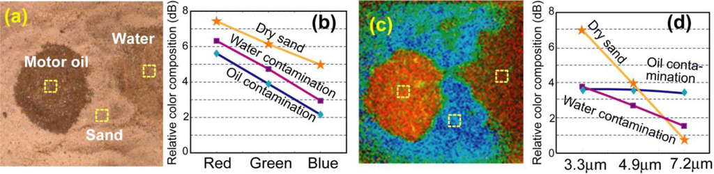 (a) Visible image of sand contaminated with oil and water. (b) RGB colorimetric decompositions of spots marked by dashed yellow square boxes in (a), which shows that the appearance difference between the three marked spots is not spectral (color) but only of intensity (lightness). (c) The M/LWIR multi-spectral false color image makes clear spectral discrimination and not just intensity discrimination between the spots. The reason is shown in (d): they have distinctive M/LWIR spectra.