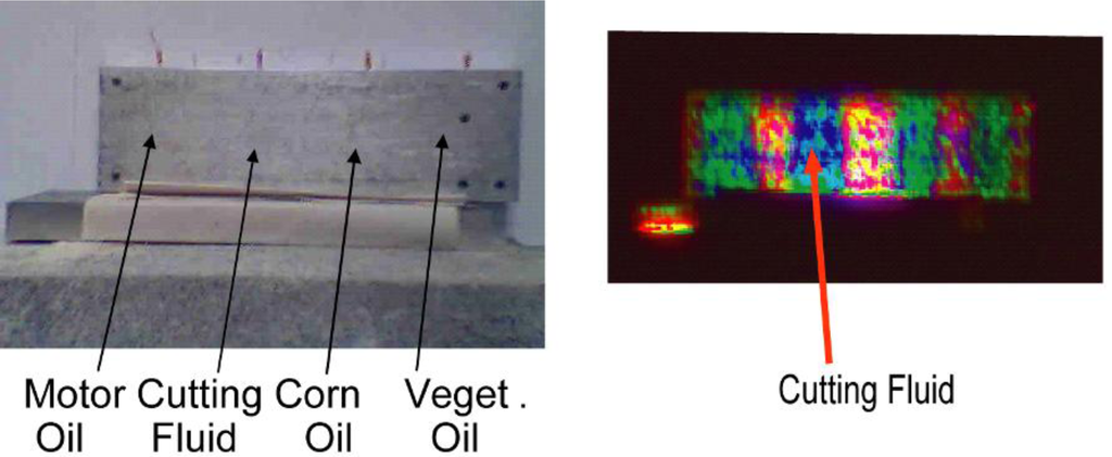 The mid-IR signatures of all oils with four wavelengths were similar and not sufficient to identify individually, although all were distinguishable from bare Al. Spectral discrimination shows only cutting fluid oil as being slightly different from the others. Measurement at just one point would not have been sufficient to infer the difference between the cutting fluid from the others with high confidence, given the signal-to-noise level of the data. Yet, imaging with phenomenological spectral contrast yields sufficient statistics with its Bhattacharyya distance 1.03 from the others, allowing inference with higher confidence that the area was indeed contaminated with something different from the rest.