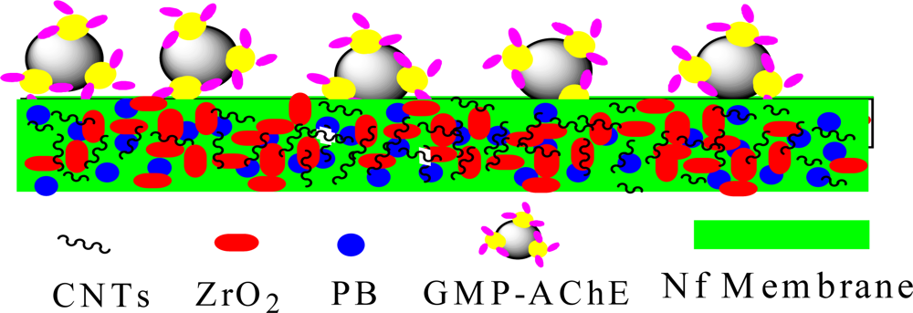 Up to now, due to their high surface area, good stability and biocompatibility, more and more attention has been paid to some conductive nanoparticle materials, such as gold colloids, carbon nanotubes (CNTs), Fe3O4 and so on, to fabricate functional-film modified electrochemical biosensors [14,15]. Among them, CNTs present a singular structure and dimensions together with unique electronic and chemical properties. As an electrode material, CNTs can facilitate electron-transfer between the electroactive species and the electrode. This makes CNTs a very attractive material to develop supersensitive electrochemical biosensors due to their outstanding ability to promote the electron transfer reactions of a great number of redox molecules [16–18]. Au colloid coated Fe3O4 magnetic nanoparticles (Fe3O4/Au, gold magnetic particles, abbreviation as GMP) were selected for the immobilization of AChE to fabricate the biosensor. The choice of GMP is based on the magnetic feature of Fe3O4 that enables a rapid separation of the immobilized enzyme in a magnetic field. In addition, the Au colloid coating would increase the biocompatibility and immobilization of AChE on GMP, then improve the stability of magnetic Fe3O4 cores [19,20]. Zirconia nanoparticle (Nano-ZrO2) is an inorganic oxide with thermal stability, chemical inertness, and lack of toxicity. Researchers have demonstrated that zirconia has a strong affinity for the phosphoric acid group. It has been used to fabricate various biosensors to determine OP residues [21,22]. Prussian blue is an easily reduced and oxidized material and often used as an electron transfer mediator which can obviously reduce the overpotential of many enzymes such as AChE [25].