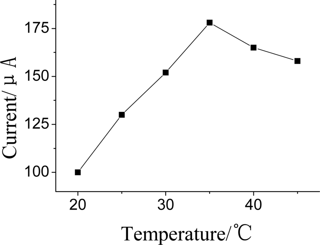 The effect of temperature on the DPV current was examined at the range from 20 to 45 °C (Figure 10). It was found that the current response increased with the increasing temperature up to 35 °C. However, it could not cause significantly change when temperature was changed over 35 °C Thus, 35 °C was selected as the optimum incubation temperature.