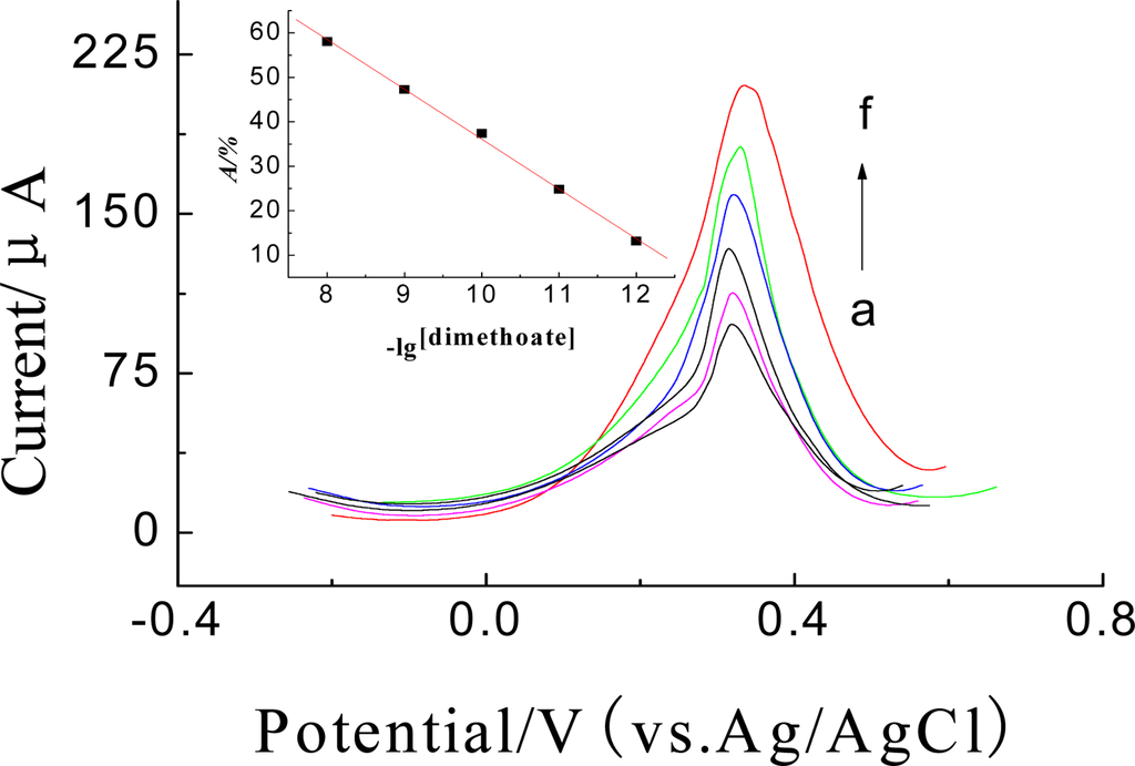 DPVs of the enymze biosensor inhibitted by (a) 10, (b) 1.0, (c) 0.1, (d) 1.0 × 10−2, (e) 1.0 × 10−3, (f) 0 ng·mL−1 dimethoate and parathion for 5 min in 25μL pH = 7.5 KNO3 solution at 35 °C. Inset: The calibration curve of A% vs. dimethoate.
