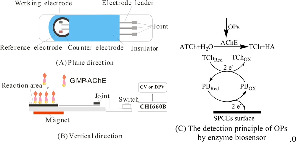 In this study, Fe3O4/Au and ZrO2 NPs composite particles had been successfully employed as sensitive membrane matrix to immobilize AChE enzyme on a SPCE’ surface to fabricate a novel disposable OPs biosensor. The results showed that the sensor could rapidly, sensitively and specifically screen/determine OPs under optimal conditions. The biosensor has such attractive advantages as: (1) the biosensor exhibited a fast response, excellent linear detection range and high sensitivity to OPs due to the conductive Fe3O4/Au NPs (GMP) being used to provide a large electrode surface area to amplify the current response signal of TCh and enhance its sensitivity. Furthermore, its manufacture cost is lower than common enzyme electrodes because GMP is an easier enzyme immobilization mediator which simplifies the experimental design and reduces the consumption of expensive reagent; (2) the biosensor has specific adsorption to OPs, because ZrO2 NPs have specificity to OPs which can remarkably decrease the interference of other matters to inhibit the activity of AChE; (3) the biosensor’s surface can be renewed easily due to the easy removal of Fe3O4/Au/AChE from the biosensor surface by applying an external magnetic field thanks to its super-paramagnetism. Thus, the proposed biosensor can be a useful approach to improve the performance of the AChE-inhibition based biosensors and an alternative method to other conventional assays for screening and determination of OP residues in vegetables and other samples.