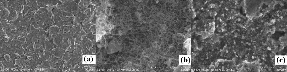 Figure 3 displays the SEM images of different preparation stages of the modified electrode. The bare SPCE has an obvious layered structure of graphite (a). A homogeneous, porous, and three-dimensional CNTs film was observed after modification with CNTs/ZrO2/PB/Nf-membrane (b). SEM images also showed that there were numerous, well distributed island structures on membrane whose sizes were about 400 nm, much greater than GMP particles. These may be GMP-AChE particles (c).