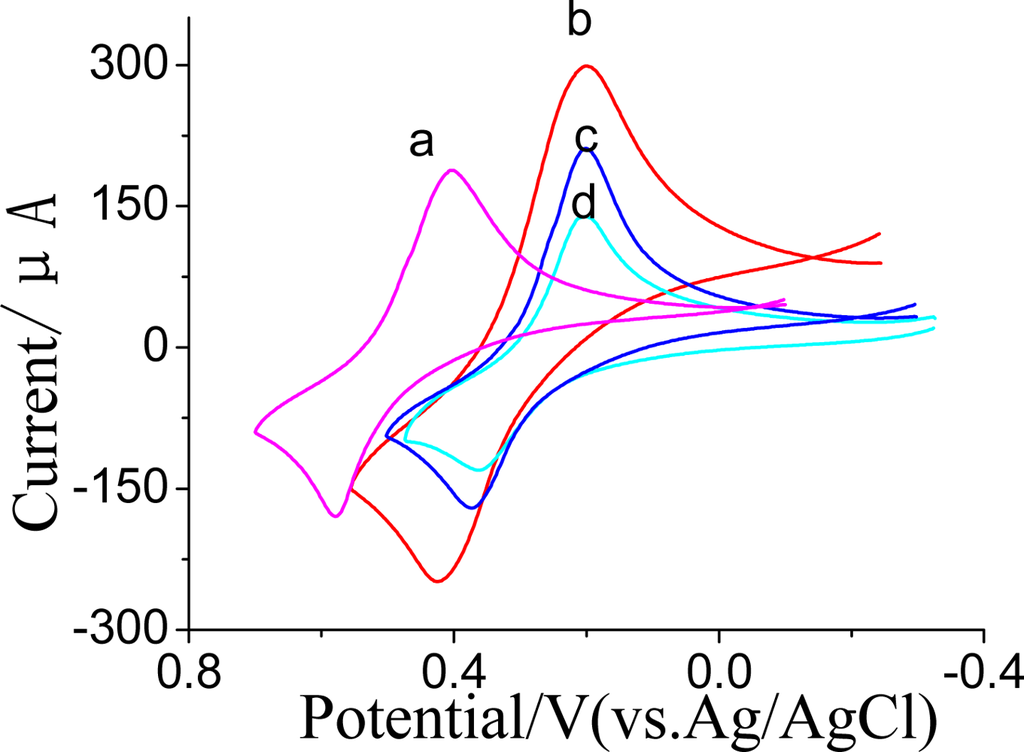 Cyclic voltammetry curves (CVs) of SPCE│CNTs/ZrO2/Nf│GMP-AChE (a), SPCE│CNTs/ZrO2/PB/Nf│GMP-AChE (b), SPCEs│ZrO2/PB/Nf│GMP-AChE (c), and c inhibitted by 1.0 ng·mL−1 dimethoate for 5 min at 35 °C (d) in 1.0 mmol·L−1 ATCh + 0.1 mol·L−1 KNO3 (pH = 7.5).