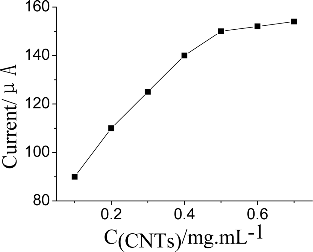 The effect of CNTs concentration on current response was studied between 0.0 and 0.8 mg·mL−1. The anodic current gradually increased with increasing CNTs content and reached a maximum at 0.5 mg·mL−1, as shown in Figure 5. Further increasing the amount of CNTs lead to a constant value, possibly because of increased resistance and double layer capacitance of the modified electrode, so 0.5 mg·mL−1 CNTs was used for preparation of the biosensor.