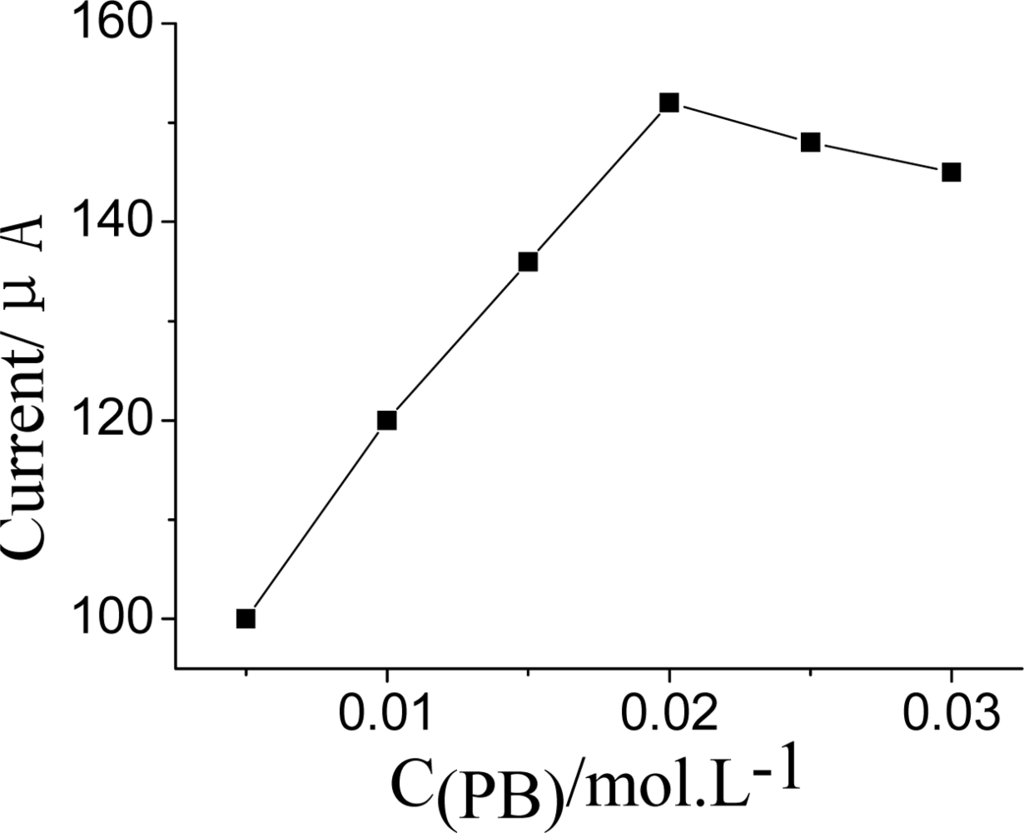 The influence of PB concentration on current response by the sensor has been also studied (Figure 6). The DPV peak current increased when the concentrion of PB was enhanced in the Nf-membrane. However, when it exceeded 0.02 mol·L−1, the DPV peak current tended to decline. It was presumed that when the amount of PB is too much it would easily leak away from the Nf membrane from the electrode surface into the electrolyte. Especially for those soluble mediators with low molecular weight, such as ferrocene (Fc) [19] or PB [25]. This resulting in poor sensor response performance. Therefore, the concentration of PB was fixed at 0.02 mol·L−1 for preparation of the Nf membrane.