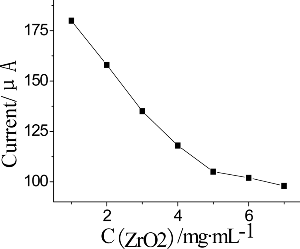 Effect of the concentration of ZrO2 in Nf membrane on DPV current. DPV conditions: 25 μL pH = 7.5 KNO3 solution containing 1.0 mmol·L−1 ATCh and after the AChE was inhibited by OPs for 5 min at 35 °C.