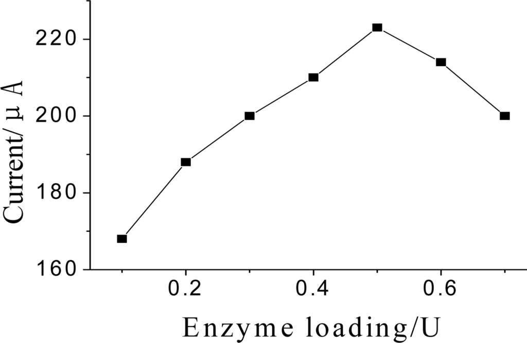 The amount of enzyme immobilized on electrode surface was another important aspect of the preparation. Figure 8 displays the effect of enzyme loading on amperometric response. When the volume of employed GMP-AChE was increased, the current of biosensor increased and then lead to a decrease of the response. More than 0.5 U adsorbed enzyme was not sufficiently stable, owing to limited electrode area, indicating saturation of enzyme loading. Therefore, the amount of enzyme immobilized on the electrode surface was set at 0.5 U.