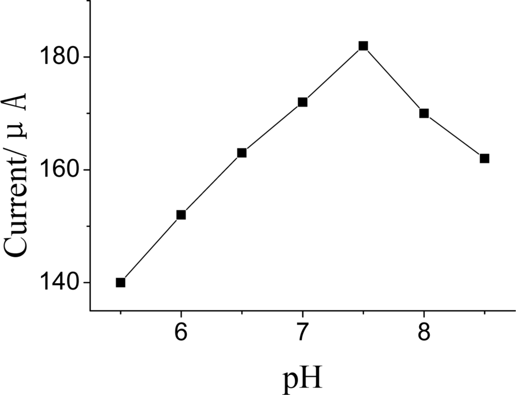 The bioactivity of the immobilized AChE depended on solution pH. Figure 9 shows the relationship between catalytic peak current of the response of AChE to ATCh and solution pH. Obviously, the maximum peak current was obtained at pH 7.5 in the pH range from 5.5 to 8.5. This result was close to that reported for the soluble enzyme, indicating that GMP-AChE composite did not alter the optimum pH for catalytic behavior of the enzyme. Therefore, pH 7.5 was used in the detection.