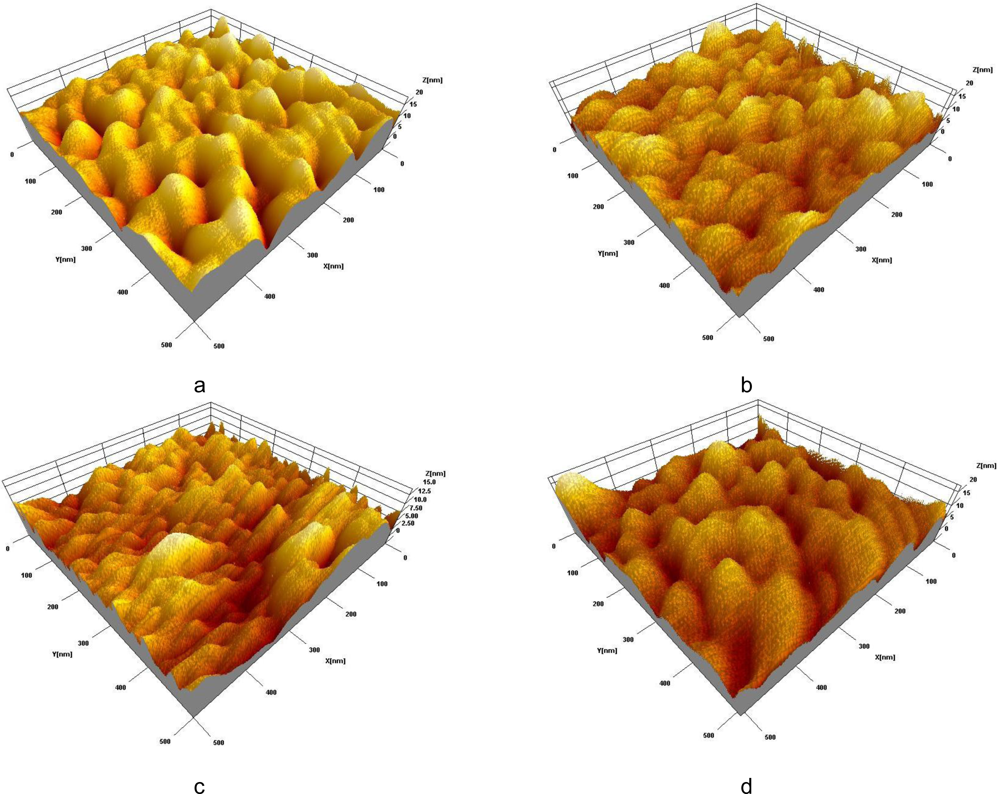 SPM images of a nano-porous aluminum surface: silanized with APTES (a); with anti-SEB immobilized (b); empty sites blocked with ethanolamine (c); morphology changes due to immunoreaction (d).