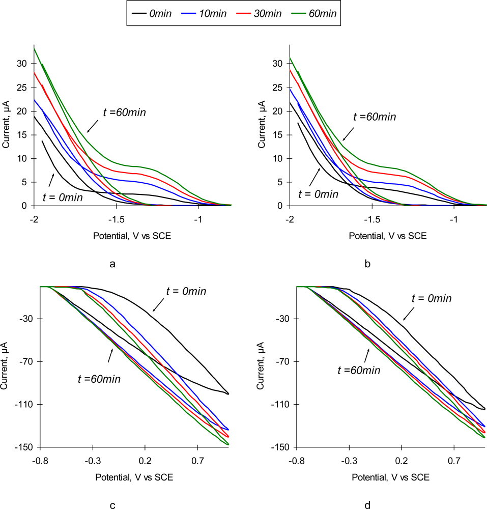 Cyclic voltammogramms of SEB immunosensors in 0.3% NaCl solution without toxin (a,c) and with addition of 10 μg/mL SEB (b,d) as a function of time (0 min, 10 min, 30 min, and 60 min).