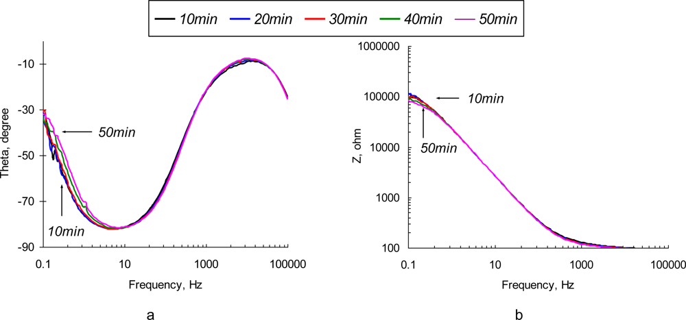 To enhance the sensor’s sensitivity one should choose the measuring conditions so that a small perturbation would cause the most significant changes in the charge transfer at the sensor interface. This regime is characterized by the highest values of the hysteresis of the CVA curves. Based on the results from CV analysis, immunosensibilized electrode was polarized at +0.1 V vs Ag/AgCl. This regime provides the maximum difference between polarization and depolarization electron transfer rate, at the sensor’s interface. As shown in Figure 5, polarization of the sensing element results in dramatic improvements of the sensor’s response over the frequency domain,. Time-dependent changes in phase angle and impedance are much more pronounced than those of a non-polarized electrode. The shapes of the spectra change significantly. The impedance value decreases as perturbation signal changes from low to high frequency, similar to the non-polarized electrode.