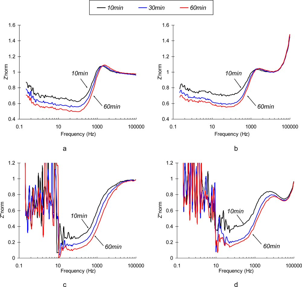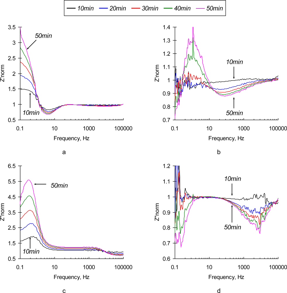 Normalized values of Z′ (a,b) and Z″ (c,d) parts of electrochemical impedance spectra of a non-polarized (φ= −0.765 V vs. Ag/AgCl) SEB immunosensor in 0.3% NaCl (a, c) and 0.3% NaCl + 10 μg/mL (b, d) as a function of time (10 min, 20 min, 30 min, 40 min, and 50 min).