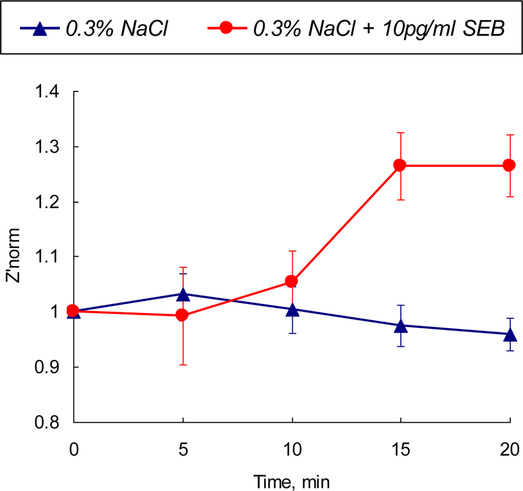 Normalized value of Z′norm at a single frequency (31 kHz) electrochemical impedance of a polarized SEB immunosensor in 0.3% NaCl and 0.3% NaCl + 10 pg/mL SEB media as a function of time.