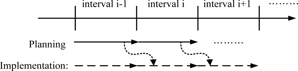 In this paper, we assume that microgrids are operated in two steps: planning and implementation, as shown in Figure 2 [,]. The MGOCC should establish an operation plan for the next interval and should implement the operation plan established during the previous interval. The interval period depends on microgrid operation rules in general.