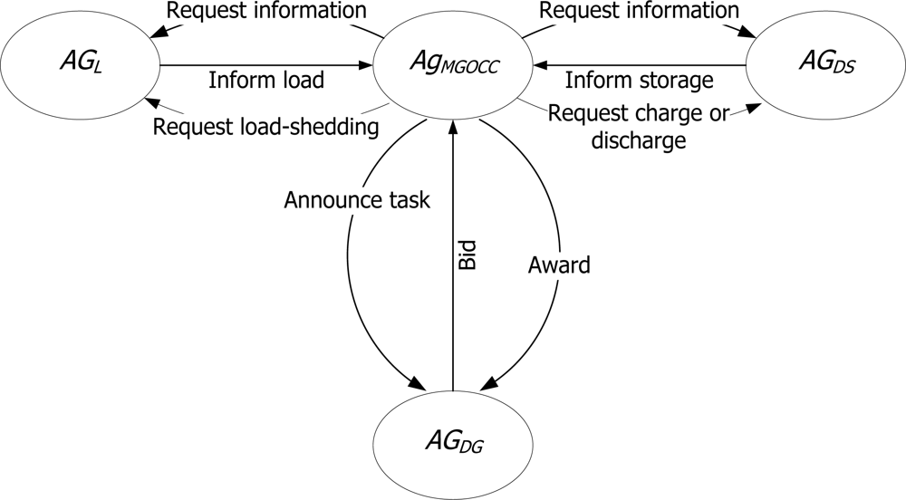 A multiagent system, which is defined by above-mentioned equation (1), is used for tests. The MGOCC agent is a manager agent for microgrid operation. For interactions among the agents, we use two communication protocols as follows: