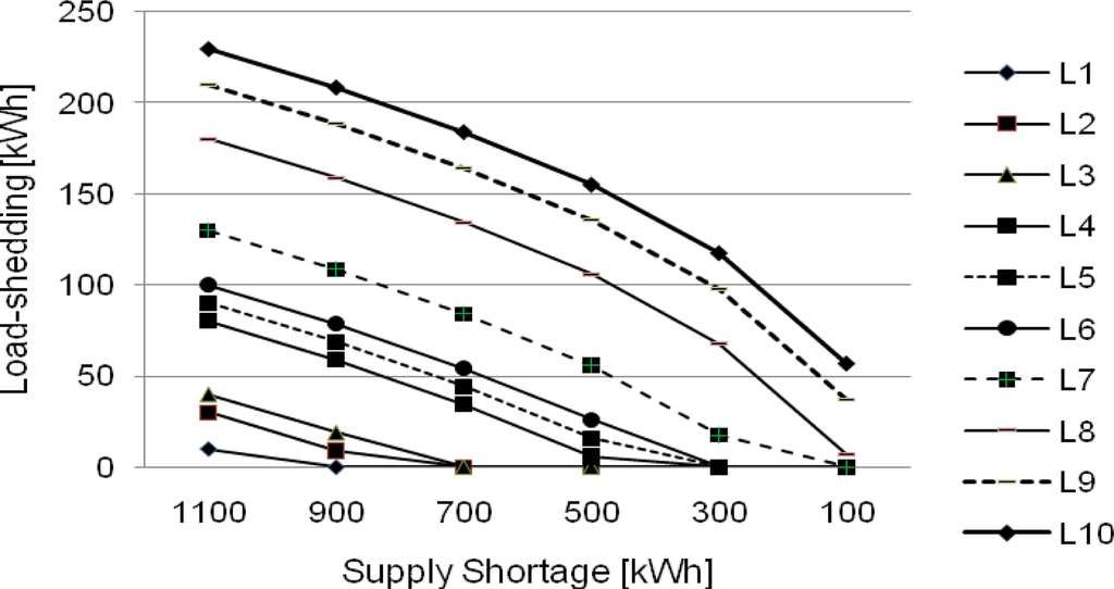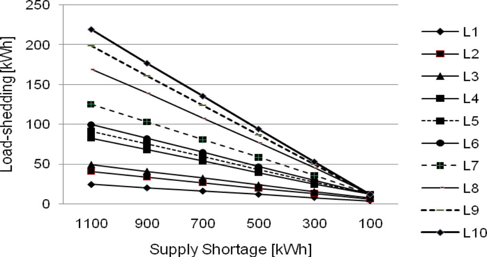 In the CEL application, as shown in Figure 8, equal load-shedding is applied to load agents not limited by their power claims and amounts of load claims are imposed to load agents limited by their power claims as load-shedding amounts in power shortage of from 1,100 kWh to 300 kWh in the figure. In power shortage of from 300 kWh to 100 kWh, equal load-shedding is applied to each load agent, where load-shedding amount imposed evenly to each load agent is less than or equal to the load amount of L1, which is smallest load.