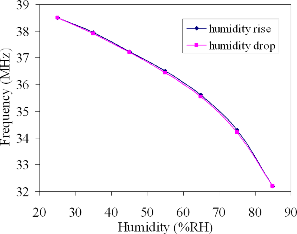 Figure 10 displays the output frequency of the humidity sensor. In this measurement, the humidity was increased from 25 %RH to 85 %RH in 35 min and then dehumidified to 25 %RH at the same rate, and the temperature was kept constant at 25 °C. The experimental results depicted that the humidity sensor had a small humidity hysteresis.