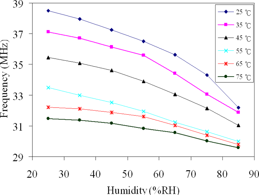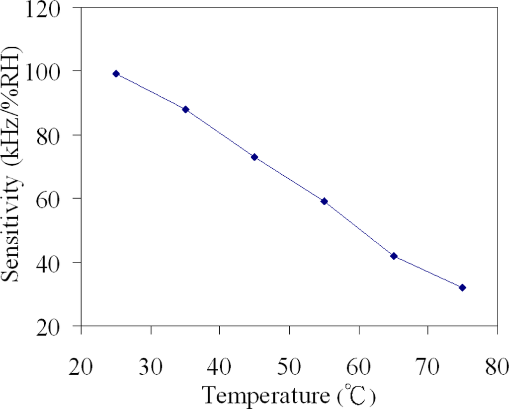 In order to understand the influence of temperature, the output frequency of the humidity sensor was tested at different temperatures. Figure 11 shows the measured output frequency of the humidity sensor at different temperatures. The sensitivity of the sensor, which was obtained by the linear fitting to the data in Figure 11, was 99 kHz/%RH at 25 °C, 59 kHz/%RH at 55 °C and 32 kHz/%RH at 75 °C. Thereby, the sensor had a better sensitivity at room temperature.