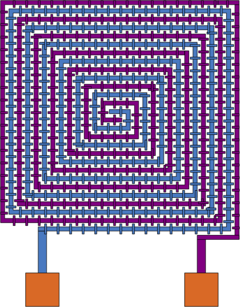 Figure 2 shows the structure of the sensing capacitor that is constructed of spiral interdigital electrodes [7]. The spiral interdigital electrodes can increase the capacitance of the sensor, resulting in enhancing the sensitivity of the sensor. The material of spiral interdigital electrodes is the metal layers of the CMOS process.