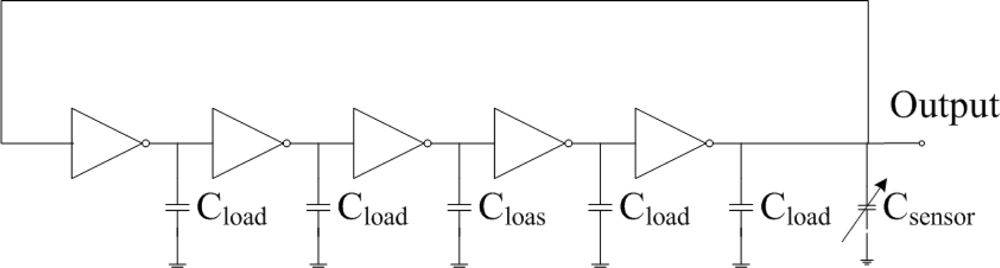 A five-stage ring oscillator is adopted as the sensing circuit owing to the fact its phase noise is smaller than that of three-stage ring oscillator, and it has a stable output signal [8]. Figure 3 illustrates the ring oscillator circuit, where Csensor represents the capacitance of the humidity sensor and Cload is the load capacitance. The ring oscillator circuit is used to convert the capacitance variation of the sensing capacitor into the frequency output. As shown in Figure 3, the circuit is a five-stage ring oscillator, which is connected by five identical inverters. The five inverters form a voltage feedback loop.
