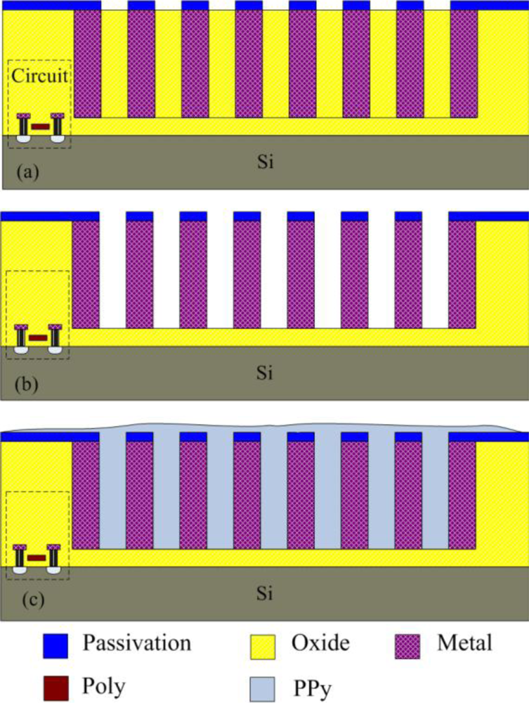 The commercial 0.35 μm CMOS process of Taiwan Semiconductor Manufacturing Company (TSMC) was utilized to manufacture the integrated humidity sensor chip. The chip requires a post-process to etch the sacrificial layers and to coat the polypyrrole film after completion of the CMOS process. Figure 5 illustrates the process flow of the integrated humidity sensor chip.